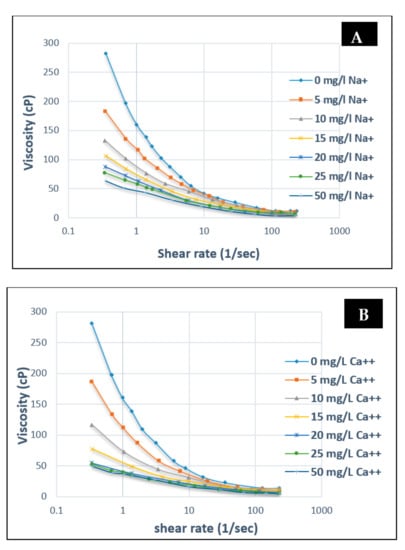 Contrary to HPAM, electrolyte addition (mono or divalent) to XG will render the polymer chain as more stable and rigid [56,62]. Zhong et al. [63] have studied the rheological behaviour of XG solution (600 mg/L) at various concentrations using Na+ and Ca2+ ions. They found that the initial addition of cations to a free XG solution had a significant effect on viscosity decrease, whereas further addition had no impact on the viscosity. Figure 14A shows that when 0 mg/L to 25 mg/L of monovalent ions are added at a 0.5 s−1 shear rate, a 72% (282 to 80 cP) decrease in viscosity was recorded. However, an additional 25 to 50 mg/L only provided a 5.7% decrease (80 to 64 cP). The same result was found in the case of the divalent ion (Figure 14B). This similarity indicates that the impact of electrolyte (mono or divalent) addition at various concentrations for XG is insignificant.