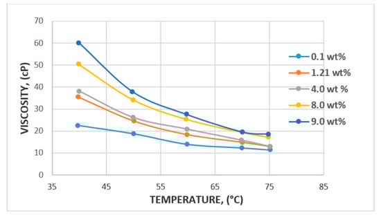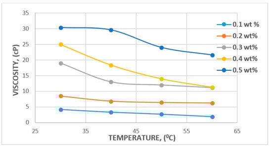 In the case of temperature, some studies have reported 100 °C to be the reservoir temperature that a polymer flood can withstand [64], with a median temperature of 46.1 °C reported by [65]. A major factor that could affect temperature change is the degradation potential of the polymer backbone or potential hydrolysis [66,67]. The major challenge faced in relation to degradation is the molecular weight of polymer and viscosity modification. However, a study by Muller [66] has found that PAM hydrolysis can occur at as low as 60 °C and that conditions such as hardness and oxygen contamination might contribute to the degree of hydrolysis at any given temperature. Following these findings, Kierulf and Sutherland [68] tested commercial XG and found that the XG solution remained constant for about 2 years at 80 °C. It was later observed that it was not until the temperature got to 100 °C and above that solution viscosity began to decrease. This, in addition to other studies by [11,69], has led to the conclusion that although both polymers are affected by temperature, the XG polysaccharide is more resistant to temperature and salinity compared to the HPAM polymer. The effect of temperature and viscosity on HPAM and XG polymers is shown in Figure 15 and Figure 16, respectively. Figure 15 represents HPAM, showing an instant steep decrease in viscosity with temperature as concentration increases, whereas, in Figure 16, a gentle decrease in XG is recorded with increase in temperature and concentration at the initial stage before a steep decrease at the later stage of the flooding process. Hence, HPAM reacts to temperature effects faster as compared to XG. This, therefore, makes XG a better candidate for a high temperature environment. A summary of some reported literature with the above discussed properties is presented in Table 1.