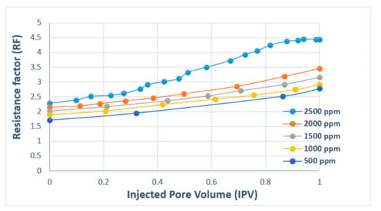 The RF (mobility ratio) is the ratio of the displacing fluid (brine mobility) to that of the displaced fluid (polymer solution) under the same flow conditions (see Equation (4)). For instance, RF = 5 denotes that it will be five times more difficult to flow a polymer solution through a system, or that five times the amount of pressure is required to inject the polymer in comparison to water.