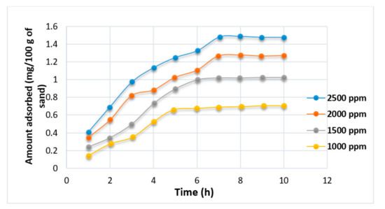 Studies by [82,83,85,86,87,88] have shown that polymer retention in a porous medium largely depends on the concentration of polymer, temperature, flow rate, size of polymer slug, brine salinity, absolute permeability of the rock, oil saturation, mineralogy, and rock wettability. The effects of HPAM polymer concentration on adsorption (see Figure 19) have been demonstrated by Mishra et al. [72], noting that higher concentrations (1000 to 2500 ppm) increase polymer adsorption significantly until a point where adsorption became saturated (constant) with time. This shows that polymer adsorption possesses a linear relationship to polymer concentration. Unfortunately, the study by Mishra et al. did not detail the effect of using an XG biopolymer on the surface of porous media. Theoretically, it is expected that the adsorption should be lower than that of HPAM because, as highlighted by [2], biopolymer retention is generally between (38 to 78 Ibm/acre-ft), whereas for HPAM it is between (35 to 1000 Ibm/acre-ft). This confirms that less adsorption will occur when XG is employed.