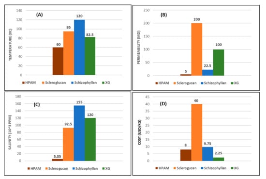 The cost of both polymers has decreased since the early 1980–1990s when the chemical EOR process was booming. According to Llano et al. [96], the cost of an HPAM product ranges between approximately USD 5–6/kg. Comparatively, as reported by Aspinall [97], the cost of XG was approximately USD 5–11/kg in the 1980s. However, current market prices suggest that an XG biopolymer can cost around USD 2–3/kg [69]. This shows that the market is shifting towards biopolymers as they are more environmentally friendly, more efficient, and effective at surviving in much higher salinity.