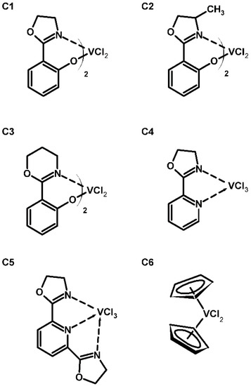 - Nomura, K.; Zhang, S. Design of Vanadium Complex Catalysts for Precise Olefin Polymerization. Chem. Rev. 2011, 111, 2342–2362. [Google Scholar] [CrossRef] [PubMed]