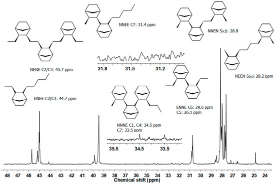 Nuclear magnetic resonance (NMR) spectroscopy is an extremely useful tool for understanding the structure of polymer. Especially the 13C NMR is necessary to describe polymer microstructures. In recent years, due to significant development in NMR instrumentation, progress made in calculation methods and in Quantum Mechanical theory has been observed. This helps more accurate prediction of NMR resonance frequencies and thus characterization of the microstructure of polymers. One of the methods of description of the E-NB copolymers microstructure is employing a computer optimization routine, which allows the best fit of the microstructural analysis by 13C NMR spectra and the derivation of reactivity ratios for both first and second-order Markov models. It should be emphasized that the spectra of cyclic olefins are relatively complex due to the presence of stereogenic carbon atoms in the polymer chain per monomer unit. Furthermore, chemical shifts of these copolymers do not obey simple additive rules [1,12,13].