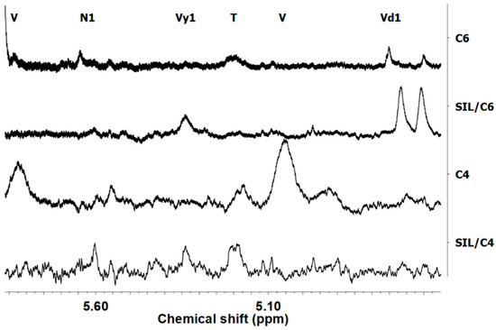 1H NMR spectra of E-NB copolymers obtained using homogeneous (C6, C4) and heterogeneous (SIL/C6, SIL/C4) catalyst with the highest NB incorporation degree (Table 1, item 27, 24, 12, 15).