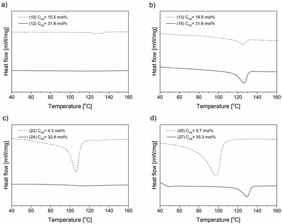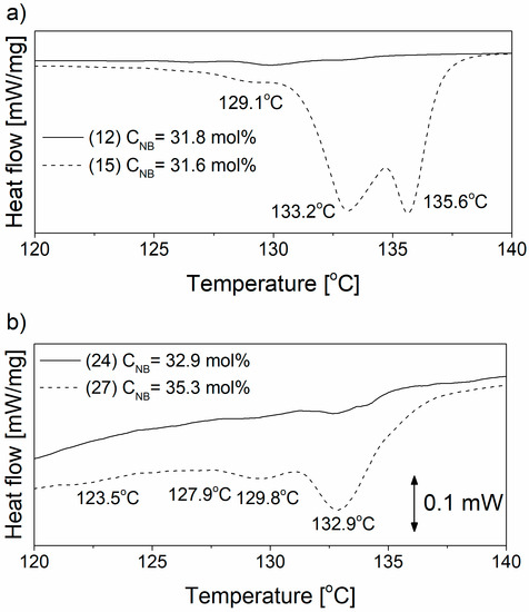 For the copolymers synthesized over the catalysts SIL/C4, SIL/C5 and SIL/C6, the endothermic peak in the DSC thermograms became broader with the increase of NB content (Figure 5b,d and Figure S32 in the Supplementary File), what suggests the increase copolymers heterogeneity.