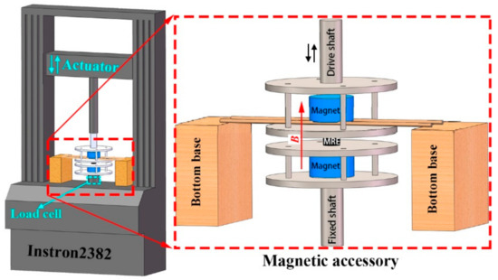 The compression tests of MRE samples under different magnetic fields were performed using a universal testing machine (Instron2382 from Instron Corporation, Norwood, MA, USA) equipped with a magnetic field accessory, i.e., a test fixture with two fixed permanent magnets, as illustrated in Figure 1. The test fixture was connected to the testing machine via two shafts. Two fixed neodymium permanent magnets (φ40 mm × 20 mm) were used to generate the desired magnetic field with the direction parallel to the axis of the drive shafts. All other parts of the test fixture were made of non-magnetic aluminum alloy with sufficient stiffness. Before each test, the magnetometer probe was placed at the center of the test space, and the magnetic flux density was adjusted by changing the distance between the two magnets. It should be noted that the distance between the magnets remained fixed throughout each test, ensuring a constant magnetic field applied to the samples along the thickness direction.