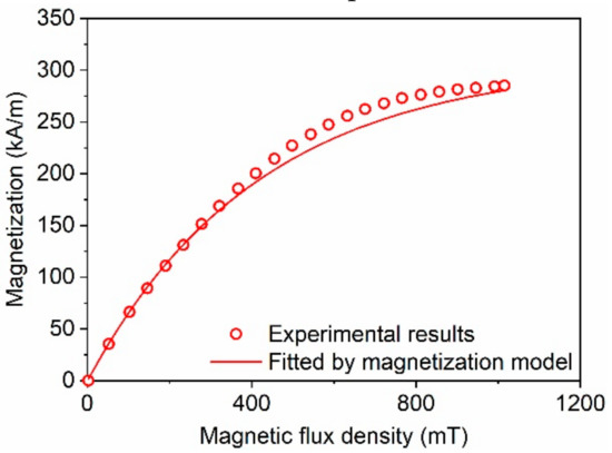 Equation (1) is used to fit the magnetization curve of the MRE, and the fitting parameters are as follows: MS = 307.6 kA/m and χ = 3.01 × 10−6 m/A. The comparison of the fitted results with the experimental data is shown in Figure 3. The precision of the fitting result was quantitatively evaluated by using the coefficient of determination R2 [20], which is defined by