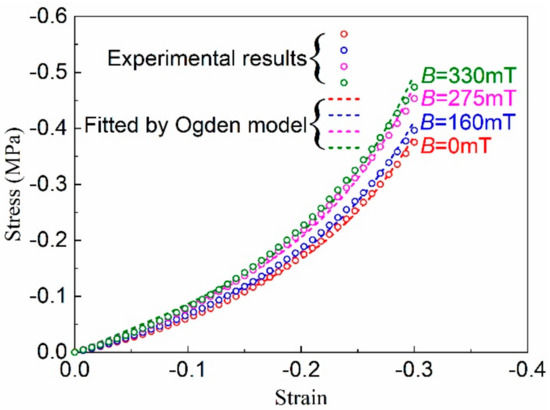 The quasi-static compressive stress-strain curves of the isotropic MRE under different magnetic flux densities are shown in Figure 4, in which the compressive stress and strain are defined as negative values, and the experimental results are plotted by the color hollow dots. It was found that at a given strain, the compression stress increased with the increasing magnetic flux density. This phenomenon is called the magnetorheological (MR) effect of MRE, which is caused by the magnetic attractions between magnetized particles in MRE under the external magnetic field [1,2]. When applying an external magnetic field, the interparticle magnetic attractions will lead to a three-dimensional network structure of magnetic particles in the MRE, which serves as a reinforcing frame and offers restriction to the mobility of the polymer chains, thus improving the stiffness of MRE under the compressive loading.
