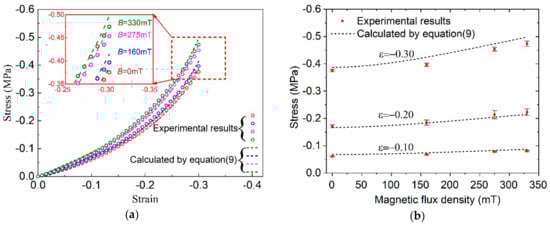 Comparison of the stresses calculated by the magneto-hyperelastic model (Equation (9)) with experimental results: (a) stress-strain curves under different magnetic flux densities; (b) stress as a function of the magnetic flux density at different strains.