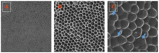 The images (100 × 100 µm2) obtained from scanning electron microscopy (SEM) of fluorinated ethylene propylene (FEP) foils modified at 8 W and 240 s, and then immersed into polymer solution containing (A) 1 g, (B) 2 g, and (C) 3 g of PLLA. Missing pore walls are indicated with arrows (selected ones).