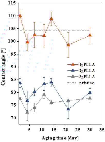 The contact angles and aging of unmodified FEP (pristine) and FEP foils modified at 8 W and 240 s and then immersed in polymer solution containing 1, 2, or 3 g of PLLA.