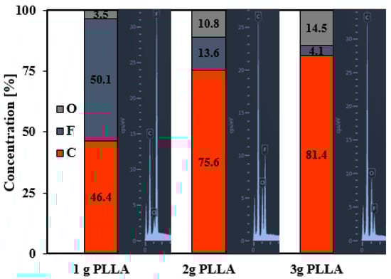 The surface concentration of elements (C, F, and O) on FEP foils modified at 8 W and 240 s and then immersed in polymer solution containing 1, 2, or 3 g of PLLA. The diagrams are presented with energy-dispersive X-ray spectroscopy (EDS) elemental signals.