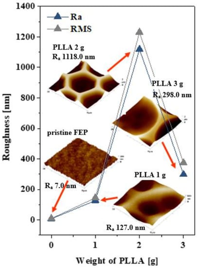 A graph of the dependence of roughness (Ra and RMS) on the amount of PLLA supplemented with the corresponding images of the surface morphology obtained from AFM is introduced in Figure 5. The sample with 2 g of PLLA surprisingly exhibited a large increase in roughness (1118.0 nm). From the AFM images, we can observe that, at 1 g of PLLA, the pore walls were the thickest, whilst increasing the PLLA narrowed them, and it looked as if the bottom of the pores was also covered with PLLA. The roughest surface had a layer with 2 g of PLLA. In contrast, pristine FEP demonstrated low values of average roughness (Ra) (7.0 nm) and root mean square roughness (RMS) and we can observe a wrinkled pattern on the surface. Images obtained from AFM confirmed the results from SEM analysis, where the lateral pore size increased with an increasing amount of PLLA. The surface areas for the studied samples were as follows: for pristine FEP, the surface area (Sa) was 100 μm2; PLLA 1 g, the Sa was 102 μm2; PLLA 2 g, the Sa was 239 μm2; and PLLA 3 g, the Sa was 110 μm2. Bui reported three main points regarding an appropriate choice of methanol as a nonsolvent to induce phase separation in normal air and to support the formation of an ordered structure. Firstly, its high affinity with water. Therefore, the enrichment of methanol in the solution through solvent evaporation is favorable for absorbing water vapor from the ambient environment. Secondly, the high solubility with water-immiscible solvents, such as chloroform, was reported, and last but not least, methanol accumulation was reported to induce the transport of polymers to the surface of nonsolvent droplets []. It was also reported that the pore sizes of the honeycomb films can be further tuned by modulating the ambient humidity and polymer concentration []. One of the results presented in [] was that the pore sizes slightly decreased with an increasing concentration of the biopolymer in the solution. Our findings regarding the influence of the amount of methanol are in good agreement with Bui [], and our preliminary testing of an increasing humidity also confirmed the results reported in the experiment of []. Our experiments presented in this article were performed under a constant humidity and ambient atmosphere. As Bui reported for the PLLA/glass system, a higher polymer concentration should provide a larger viscosity, thus leading to the formation of slightly small pores. Our results indicate that, with an increasing amount of PLLA, the pore size increased. This phenomenon is probably based on different surface wettability and roughness values, which also significantly change the surface entropy, since entropy was also discussed in [], where the slightly increased entropy was reported to be responsible for the slightly smaller pore diameter. Plasma activation for honeycomb pattern formation was also successfully applied by Babyal et al. [] under a controlled humidity. The fluorine plasma led to the formation of superhydrophobic surfaces.