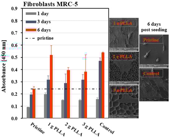 The viability of MRC-5 cells was measured using an assay that measures the cellular viability, known as the WST-1 test (Sigma Aldrich, St. Louis, MO, USA), as in ref. [], which consists of the transformation of WST-1 reagent into colored formazan. First, the tested samples were placed at the bottoms of 12-well dishes (Ø 2.14 cm, VWR, Radnor, PA, USA), sterilized by 70% ethanol (99.9% purity) for 30 min., rinsed with sterile phosphate buffered saline (PBS, pH 7.4), and weighted to the bottom of the wells with poly(methyl)methacrylate cylinders (Zenit, Prague, CZ). Then, 15,000 cells per cm2 were seeded onto the samples in 1 mL of complete MEM in triplicate. After 1, 3, and 6 days of cultivation, the medium was removed, and the cells cultured on the PLLA samples and controls were rinsed with PBS, which was then replaced with WST-1 (1:20) soluted in complete phenol red-free MEM medium (Thermo Fisher Scientific, Waltham, MA, USA); the cells were incubated for 2 h. After that, the culture medium was transferred to sterile 96-well plates (100 μL per well, 4 wells per sample) and the absorbance of the arisen formazan was spectrophotometrically recorded at 450 nm (the reference wavelength of 650 nm). As controls, MRC-5 cells seeded on standard tissue culture polystyrene wells (PS) of 12-well dishes and on pristine FEP were used.