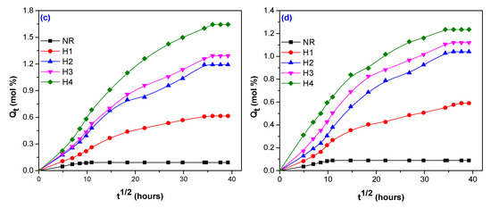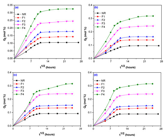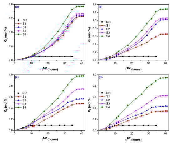 Qt variation versus immersion time for blends based on Natural rubber (NR) and hemp, irradiated at 75 kGy (a); 150 kGy (b); 300 kGy (c); and 600 kGy (d).