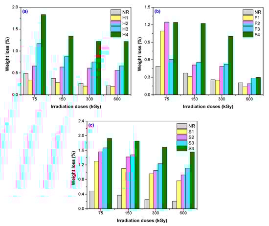 Weight loss variation for NR samples reinforced with hemp (a), flax (b), and sawdust (c).
