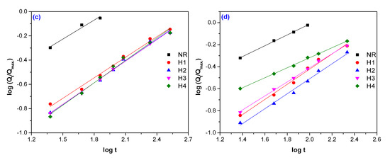 Determination of the diffusion parameters n and k for NR samples reinforced with hemp and vulcanized by electron beam (EB) irradiation at 75 kGy (a), 150 kGy (b), 300 kGy (c), and 600 kGy (d).