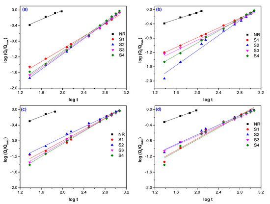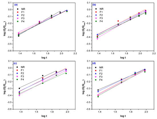 Determination of the diffusion parameters n and k for NR samples reinforced with flax and vulcanized by EB irradiation at 75 kGy (a), 150 kGy (b), 300 kGy (c), and 600 kGy (d).