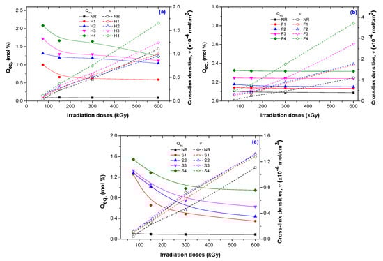 Qeq. (mol%) vs. cross-link densities (ν) [42,44,45] of NR samples reinforced with hemp (a), flax (b), and sawdust (c).