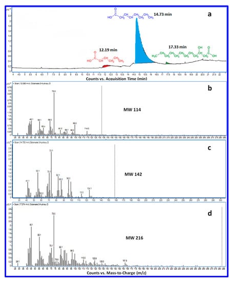 PHO was characterized in terms of the monomer structure and composition by GC-MS analysis through its conversion to volatile carboxylic acids (Figure 1). The gas chromatogram showed a major peak with the retention time of 12.19 min and two minor peaks at 14.73 and 17.33 min (Figure 1a). The major peak corresponds to 3-octenoic acid, the first minor peak corresponds to trans-2-hexenoic acid, while the second minor peak was identified as 3-hydroxy-dodecanoic acid by comparing molecules in the GC database. Therefore, the biosynthesized PHO was mostly composed of 3-hydroxyoctanoate (3HO—C8), which represents 95.02 mol% of the total monomer content and very small amounts of 3-hydroxyhexanoate (3HHx—C6, 3.32 mol%) and 3-hydroxydodecanoate (3HDD—C12, 1.66 mol%) (Figure 1b–d). All products were detected in the form of single-type monomers only.