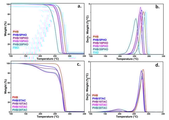 TGA and DTG curves for neat PHB, PHO (a,b) and TAC (c,d) plasticized PHB films.