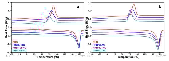 During cooling, a downshift of Tc was induced by the presence of both modifiers in PHB (Table 2, Figure 3a,b). For the highest amount of PHO and TAC, the depression of the Tc values was significant, of 13.3 and 11.9 °C, respectively (Table 2). This may be attributed to increased mobility up to a lower temperature. Further, with increasing PHO content in PHB films, Tc peaks became broader, pointing out the presence of a large range of crystallite sizes and possible increased compositional heterogeneity (Figure 3a,b). No major differences were noticed during the second heating cycle as compared to the first one (Figure S2, Supplementary Materials).