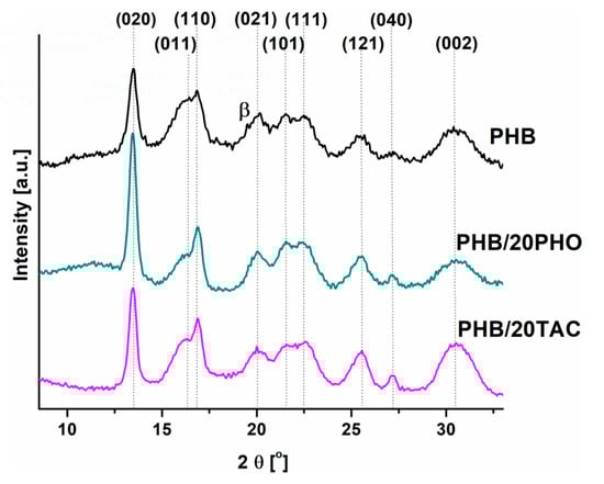 The XRD spectra of neat PHB and PHB blends with the highest proportion of TAC and PHO are presented in Figure 4.