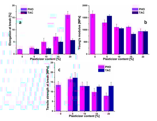 The evolution of the mechanical properties of neat and modified PHB films is shown in Figure 5. Both modifiers increased the flexibility of PHB films in correlation with their amount in the blends but the effect was much more significant in the case of PHO, which emerges as an efficient toughening agent. Thus, at maximum PHO and TAC content, the elongation at break was higher, with 700 and 185%, than that of neat PHB (Figure 5a). This means that PHO induced four times higher ductility. On the other hand, both modifiers led to a similar decrease in the elastic modulus down to close values, 944 and 938 MPa, for PHB films containing 20 wt% PHO and TAC (Figure 5b). Interestingly, at low PHO and TAC content (5 wt%), the strength of PHB blends was improved by around 22 and 27% as against neat PHB. However, when the content of modifiers exceeded 10%, the tensile strength of PHB/PHO films underwent a gradual reduction, while that of PHB/TAC remained in the same range (Figure 5c). Lower strength and elastic modulus values were reported for PHB modified by different plasticizers and toughening agents [,]. This may be due to the different preparation conditions and PHO composition, the PHO used in this study being almost a homopolymer, with 95 mol% 3-hydroxyoctanoate units. The eight times increase in the elongation at break is very important given that a small increase in PHB elongation was reported, even for high concentrations of low molecular weight plasticizers [,,]. On the other hand, TAC behaves as a common plasticizer, acting as a spacer between PHB molecules and allowing limited flexibility. The excellent effect of PHO on the ductility of PHB may enable the design of new PHB-based materials with a wider range of mechanical properties, thereby increasing the potential of their application in soft tissue engineering, packaging, or other applications where the balance of ductility and stiffness is a must.