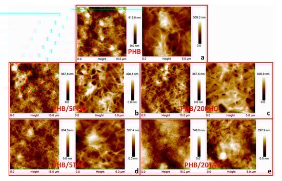AFM topographic images (height) of neat (a) and modified (b–e) PHB films at 15 (left) and 5 μm (right) scan areas.