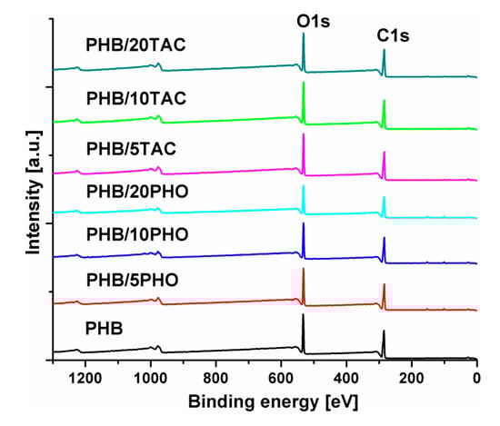 XPS analyses show the surface modification and composition of PHB after the addition of modifiers. XPS survey spectra of neat PHB and PHB blends are presented in Figure 7. The results show the presence of O and C as main elements and also some impurities consisting of Si and metal traces (less than 2%). Therefore, the lower thermal stability of PHB-PHO blends (Figure 1) may be due to these impurities, which catalyze the depolymerization reaction of PHB by β-elimination []. The corresponding elementary content and carbon to oxygen ratios are given in Table 4.