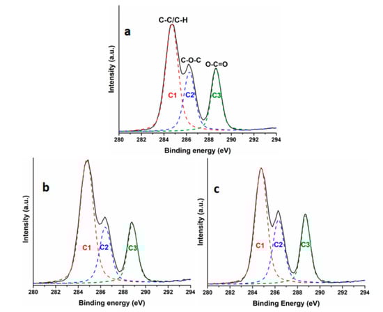 Figure 8a–c shows the XPS C1s spectra of neat PHB and PHB films containing the maximum PHO and TAC content.