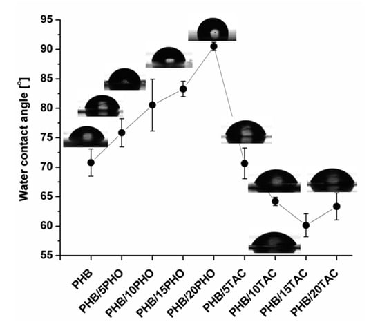 Higher crystal sizes perpendicular to the (020), (110), and (040) planes were observed for the PHB films containing PHO and TAC, similar to other observations []. This increase in crystal size may be due to the greater order of the crystal structure after the addition of modifiers.