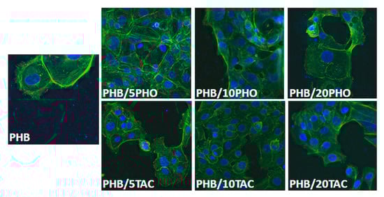 Thus, moderate cell adhesion was observed in the case of plain PHB and PHB-20PHO (Figure 10). The moderate cell adhesion in the case of plain PHB is a well-known behavior []. Meanwhile, a high amount of PHO (PHB/20PHO) led to increased hydrophobicity and a contact angle of around 90°, due to the surface-oriented hydrocarbon-containing moieties []. This was further reflected in the weaker cell adhesion. Previous studies have shown that better cell adhesion was observed on surfaces with a medium value of the contact angle, of around 70° [,]. Therefore, very high or a very low hydrophobicity is not effective in cell adhesion. Indeed, the samples with the best cell adhesion were those with a contact angle between 65° and 75° (PHB/5PHO, PHB/10PHO, PHB/10TAC), therefore around 70°, as generally accepted [,]. However, the different behavior of PHB/5TAC supports the idea that there are other factors that influence the biocompatibility. Similarly, PHB/20TAC, with a contact angle close to that of PHB-10TAC, showed slightly poorer cell adhesion. It is worth mentioning that PHB/5TAC and PHB/20TAC showed very low roughness compared to PHB and PHB-PHO films, and it was reported that a lower degree of roughness is not favorable to cell attachment and proliferation [,].