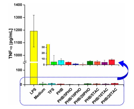 To obtain more insight into the biomedical suitability of the modified PHB films, the evaluation of inflammatory susceptibility was assessed by measuring the release of TNF-α (Figure 11).