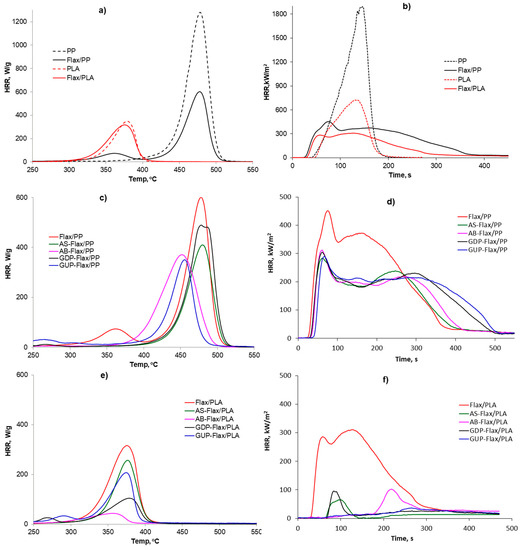 Heat release rate (HRR) versus (a,c,e) temp in pyrolysis flow calorimetry (PCFC) and (b,d,f) time in cone calorimetry at 35 kW/m2 for flax/PP and flax PLA composites, and PP and PLA plaques.