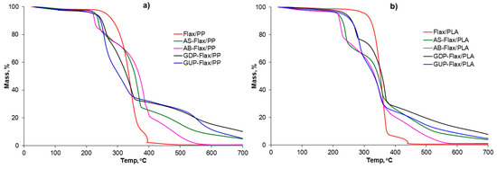 As can be seen from Figure 3, the effect of FRs is similar in both flax/PP and flax/PLA composites. Onset of decomposition (TOnset) is decreased in all fire retarded samples compared to the respective flax/PP or flax/PLA control samples, the exact value depending upon the FR type. In all cases, the first mass loss representing the thermal decomposition stage in the control samples has changed to a two-step process in fire retarded samples, with overall mass losses less than those of the respective controls (flax/PP or flax/PLA), whereas mass loss in the last (oxidation of the char) stage is more in fire retarded samples than in the control samples. The char yields depend on FR type in both flax/PP and flax/PLA. Since both flax/PP and flax/PLA contain 50% flax, the effect of each FR on this component in both composites should be same, and any differences should be due to the reactivities of the FRs towards the PP or PLA component.