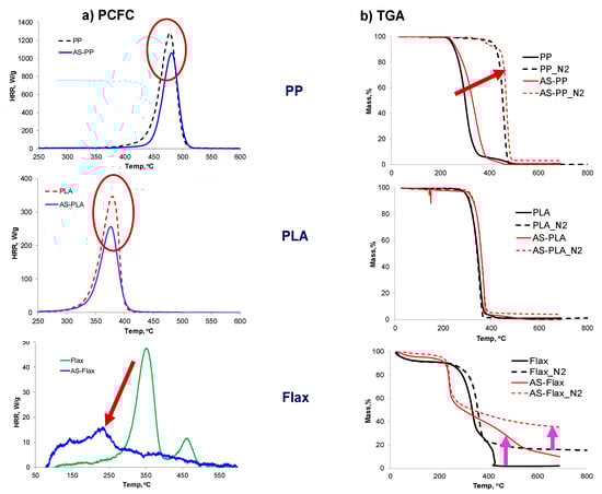 In order to understand the role of each component in a composite, PCFC and TGA in air and nitrogen of PP, PLA, and flax are plotted in Figure 4. The PCFC of composites are also given for comparison. The differences seen previously for temperature ranges of the peaks in PP and PLA polymers and their composites is replicated by decomposition temperature range in TGA under N2. The thermal decomposition of PP in air and nitrogen are very different as discussed in detail in the literature [29]. PP undergoes chain scission, demonstrated by a single mass loss step in nitrogen. In air chain scission is catalysed by oxidation of PP at tertiary H giving hydroperoxyl groups which then undergo thermolysis to give hydroxyl and polymeric carboxy radicals. The hydroxyl radicals catalyse further oxidation. The carboxy radicals undergo rearrangement and scission giving carbonyl-ended chains and polymeric radicals capable of unzipping to give volatile oligomeric fragments [29]. There is a small amount of crosslinking also which leads to incipient char formation (see Table 5). The higher decomposition temperature range in nitrogen explains the long time-to-PHRR in PCFC. PLA thermally decomposes in a set of sequential and parallel reactions consisting of (i) intra- and intermolecular ester exchange producing lactide and cyclic oligomers, (ii) cis-eliminations producing acrylic acid and acyclic oligomers and (iii) radical and concerted reactions producing acetaldehyde, carbon monoxide, and carbon dioxide; no char is formed [33].