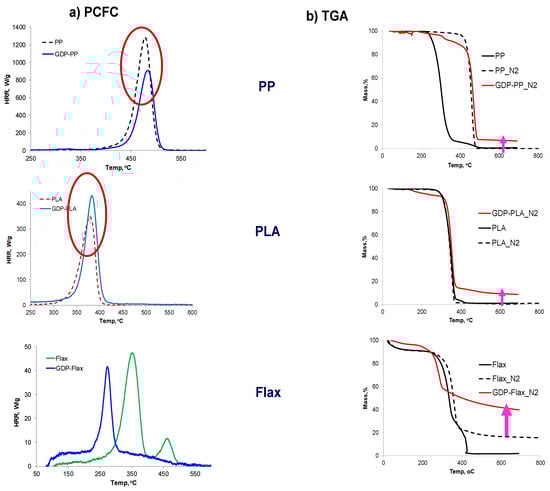 (a) PCFC and (b) TGA curves (in nitrogen) of GDP treated PP, PLA, flax, flax/PP, and flax/PLA.