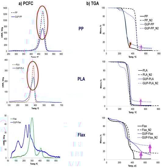 (a) PCFC and (b) TGA curves (in air and nitrogen) of GUP treated PP, PLA, flax, flax/PP, and flax/PLA.