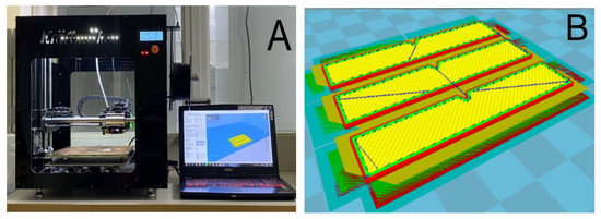 (A) Photo of the fused deposition modelling (FDM) printer; (B) the Cura interface used to control the printing process.