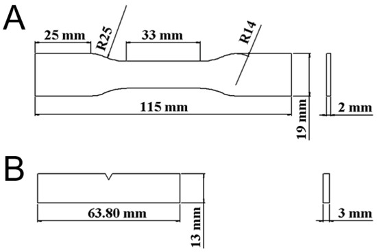 Layouts and dimensions of the (A) tensile test part and (B) impact test part.