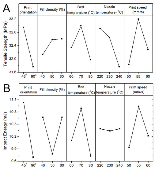 The S/N ratio indicates the level of robustness of a production process by assessing the relative influences of the control variables (signals) and those of the uncontrolled variables (noises) [10,13]. The influence of each processing parameter on the product quality can consequently change with the variation in S/N. From Figure 7A, the influence of each parameter on the tensile strength of the CFR-PLA parts was, from high to low, bed temperature (ΔS/N = 5.036 dB), print orientation (ΔS/N = 0.410 dB), print speed (ΔS/N = 0.397 dB), nozzle temperature (ΔS/N = 0.285 dB), and fill density (ΔS/N = 0.166 dB). Meanwhile, in line with the data presented in Figure 7B, the significance ranking of each parameter on the impact strength of the FDM-printed CFR-PLA composites was bed temperature (ΔS/N = 4.071 dB), print orientation (ΔS/N = 1.143 dB), fill density (ΔS/N = 0.746 dB), fill speed (ΔS/N = 0.578 dB), and nozzle temperature (ΔS/N = 0.223 dB). For the variables chosen in this analysis, bed temperature was identified as the most important parameter affecting the tensile strength of the CFR-PLA-printed parts, while bed temperature and print orientation were found to affect mostly the impact strengths of the printed composites.