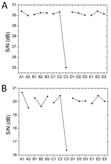 where yi is the measured tensile strength for the ith test part and n represents the number of test parts. The largest S/N ratios indicate optimal factor levels that minimize the noise sensitivity.