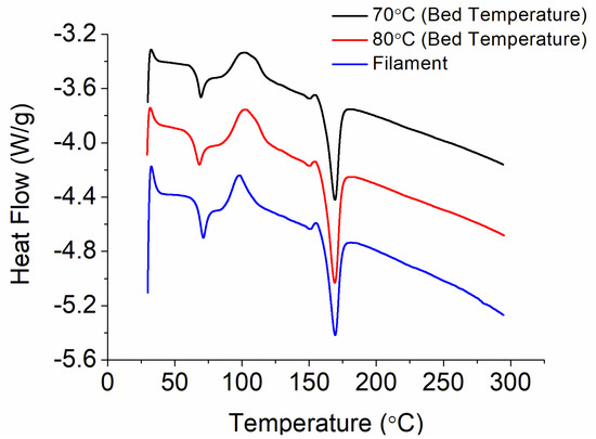 The thermal properties of the CFR-PLA filaments and CFR-PLA composites printed with bed temperatures of 70 °C and 80 °C were characterized, and the result is shown in Figure 8. Based on the melting and crystallizing enthalpies, the measured crystallinities were 20.6%, 19.3%, and 23.8%, respectively, for the CFR-PLA filaments and the 70 °C- and 80 °C-printed CFR-PLA composites. Obviously, the 80 °C-printed composite exhibited a greater crystallinity than the 70 °C-printed composite. Meanwhile, due to the quenching effect of the print bed, 70 °C showed a lower crystallinity than the filaments.