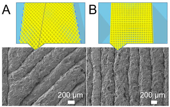 Print orientation and the SEM image of the printed composite parts ((A): 45°, (B): 90°).