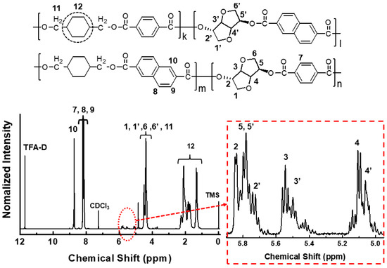 The composition of monomers: ISB, CHDM, TPA, and NDA was estimated from the integration of peak intensities of each proton of each monomer. The actual chemical composition of synthesized PCITN copolyester was determined by 1H-NMR spectroscopy. 1H-NMR and assignments of characteristic chemical shifts (δ) (ppm) are shown in Figure 1. Characteristics δ (ppm) peaks at 4.60, 2.12, 1.95, and 1.35 are assigned to trans-CHDM. While δ (ppm) peaks at 4.70, 2.25, 1.83, and 1.70 ppm are assigned to cis-CHDM isomers. δ (ppm) peaks observed at 4.52, 5.84, 5.54, 5.10, 5.80, and 4.36 ppm are assigned to hydrogen atoms 1, 2, 3, 4, 5, and 6 of the ISB linked with terephthalic units. The peaks for 1 and 6 overlap with the hydrogens (11) of the CHDM moiety. δ (ppm) peaks observed at 4.50, 5.73, 5.50, 5.06, 5.78, and 4.34 ppm are assigned to hydrogen atoms 1′, 2′, 3′, 4′, 5′, and 6′ of ISB between the naphthalic unit and the terephthalic unit. The peaks for 1′ and 6′ overlap with the hydrogens (11) of the CHDM moiety.