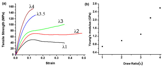 Mechanical properties of cold-drawn PCITN films: (a) Tensile strength and (b) Young’s modulus as a function of draw ratio (λ).