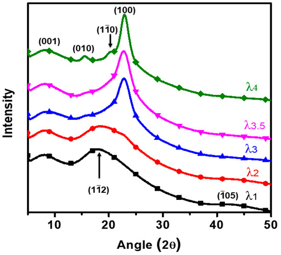 The XRD spectrum of the developed PCITN film specimens at the ambient room temperature from 5 to 50 is shown in Figure 3. Three diffraction peaks for the randomly oriented PCTIN film with λ1 that appeared at 7.84°, 18.72° and 42.90° are corresponding to the Miller indices of (001), (12) and (05), respectively. The peaks observed at 18.70° and 42.92° are the characteristic peaks of amorphous regions, while the peaks observed at 7.84° are corresponding to the crystalline regions of undrawn (DR1) film. This indicates that as-synthesized PCITN film is semi-crystalline, and it has relatively low crystalline regions compared to stretched films. However, based on the XRD analysis, the reduction in amorphousness of PCITN film can be seen as the intensity of the amorphous peaks decreases with increasing λ. The new peaks are observed at 15.76°, 17.68°, 20.12°, and 23.08° at higher stretching (λ > 3), indicating that at the microscopic level the regular arrangement of molecular chains of the films increases with increasing stretching. These peaks are attributed to the new crystallites that appeared due to stretching and they are attributed to the Miller indices of (010), (11), (10), and (100), respectively [34,35]. It indicates the appearance of the new crystalline regions at the expense of amorphous regions due to the SIC at higher stretching (λ > 3).