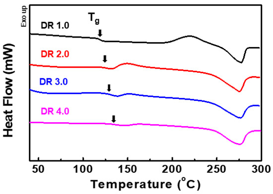 Fabricated film specimens were thoroughly characterized using DSC for their Tg, Tm, cold crystallization temperature (Tcc), cold crystallization enthalpy (ΔHc in J/g), and the melting enthalpy (ΔHm in J/g). Only, the first heating thermogram (40 to 300 °C) of DSC was recorded to study the effect of stretching on the thermal properties of the films. The degree of crystallinity (Xc) of all the film specimens was also calculated from XRD analysis by the integration of corresponding amorphous and crystalline peaks. For accurate results, fabricated films were analyzed four times. Tg was estimated as the onset point in heat capacity associated with a transition.