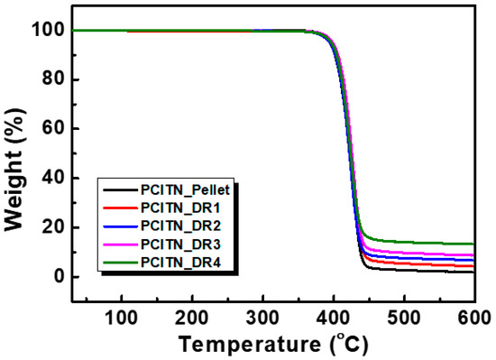Thermal degradation behavior of the fabricated PCITN films stretched at different λ were determined using TGA and the corresponding thermograms, indicating the high thermal stability, are shown in Figure 5. The temperature corresponding to 5% wt loss of the initial weight and residue (%) at 600 °C were recorded from TGA thermograms, and the results are summarized in Table 2. It is evident from the TGA thermograms that all the analyzed samples have a one-stage decomposition, indicating that they have a random copolymer structure. The residue (%) at 600 °C is increased with increasing λ due to increased crystallinity (%) of the resultant stretched polymeric films. The same finding was reported by Um et al. [39]. The high thermal stability of the fabricated film makes it suitable for applications where high thermal stability is required.